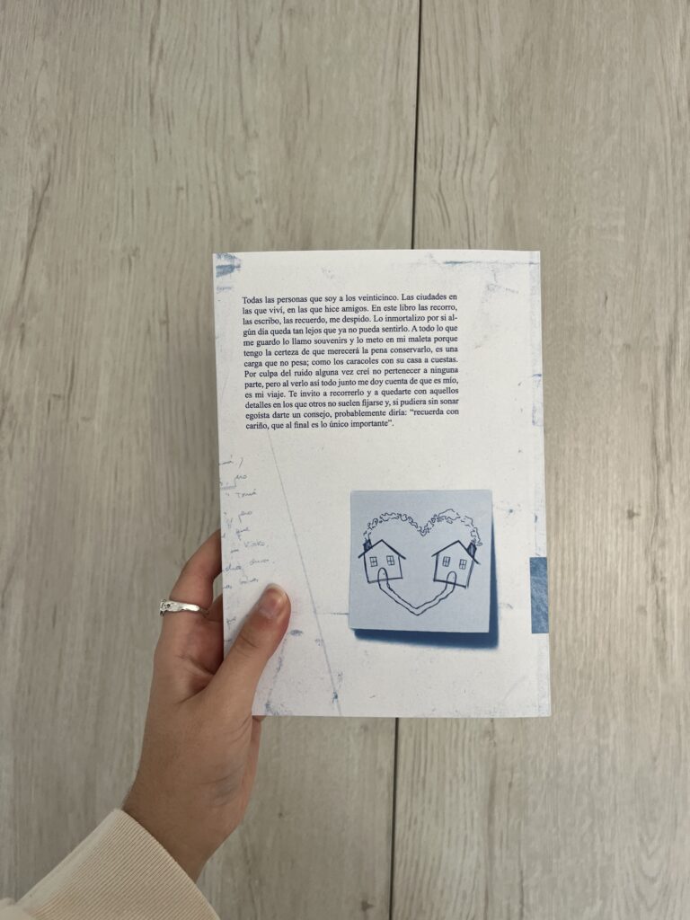 Todas las personas que soy a los veinticinco. Las ciudades en las que viví, en las que hice amigos. En este libro las recorro, las escribo, las recuerdo, me despido. Lo inmortalizo por si algún día queda tan lejos que ya no pueda sentirlo. A todo lo que me guardo lo llamo souvenirs y lo meto en mi maleta porque tengo la certeza de que merecerá la pena conservarlo, es una carga que no pesa; como los caracoles con su casa a cuestas. Por culpa del ruido alguna vez creí no pertenecer a ninguna parte, pero al verlo así todo junto me doy cuenta de que es mío, es mi viaje. Te invito a recorrerlo y a quedarte con aquellos detalles en los que otros no suelen fijarse y, si pudiera sin sonar egoísta darte un consejo, probablemente diría: “recuerda con cariño, que al final es lo único importante”.